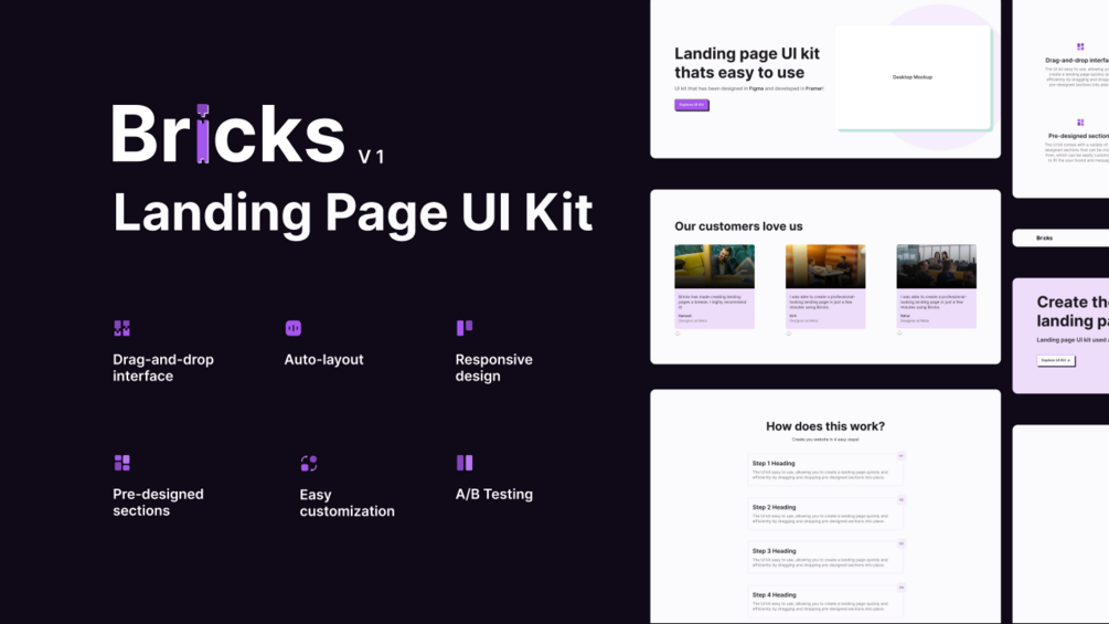 Bricks Landing Page UI Kit has been designed in Figma and developed in Framer. The UI kit contains landing page sections that have been divided into bricks. A landing page can be easily made by dragging & dropping sections onto a frame.